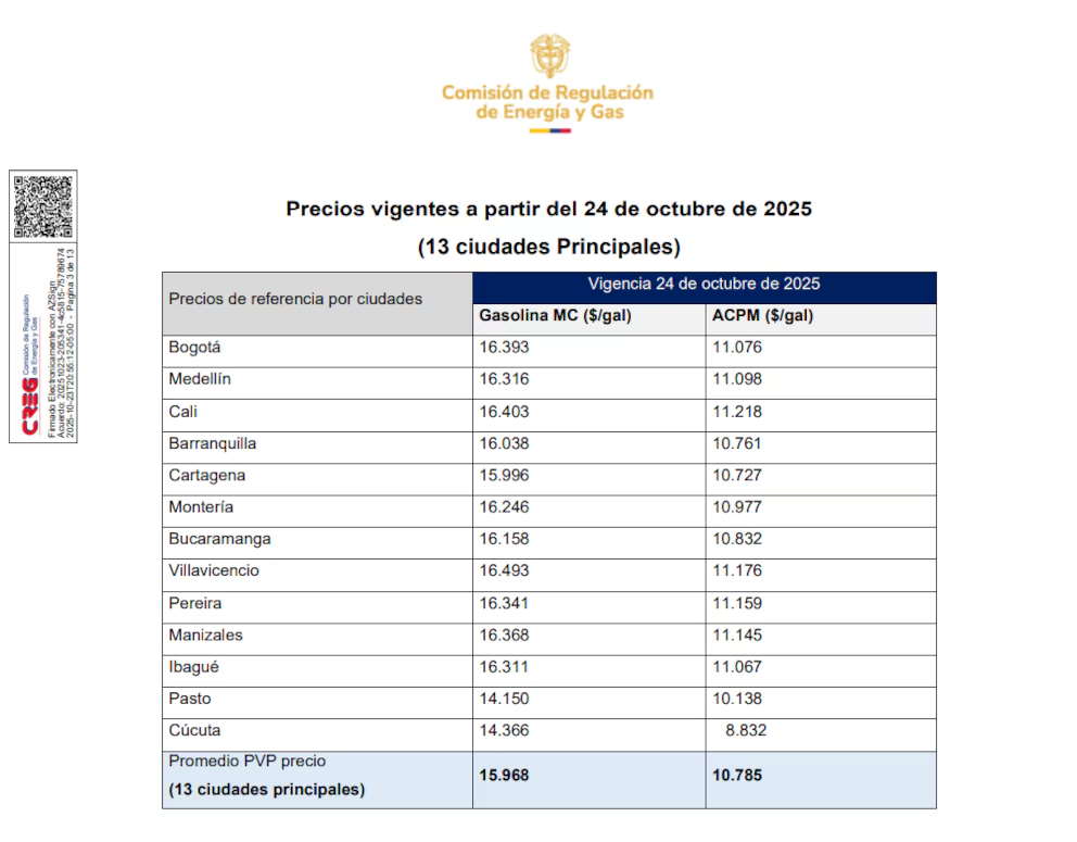 Villavicencio registra el costo más alto, con 16.493 pesos por galón, mientras que Pasto mantiene el precio más bajo, 14.150 pesos. En ciudades intermedias, el valor oscila entre 16.000 y 16.400 pesos, dependiendo de la distancia a los centros de distribución.